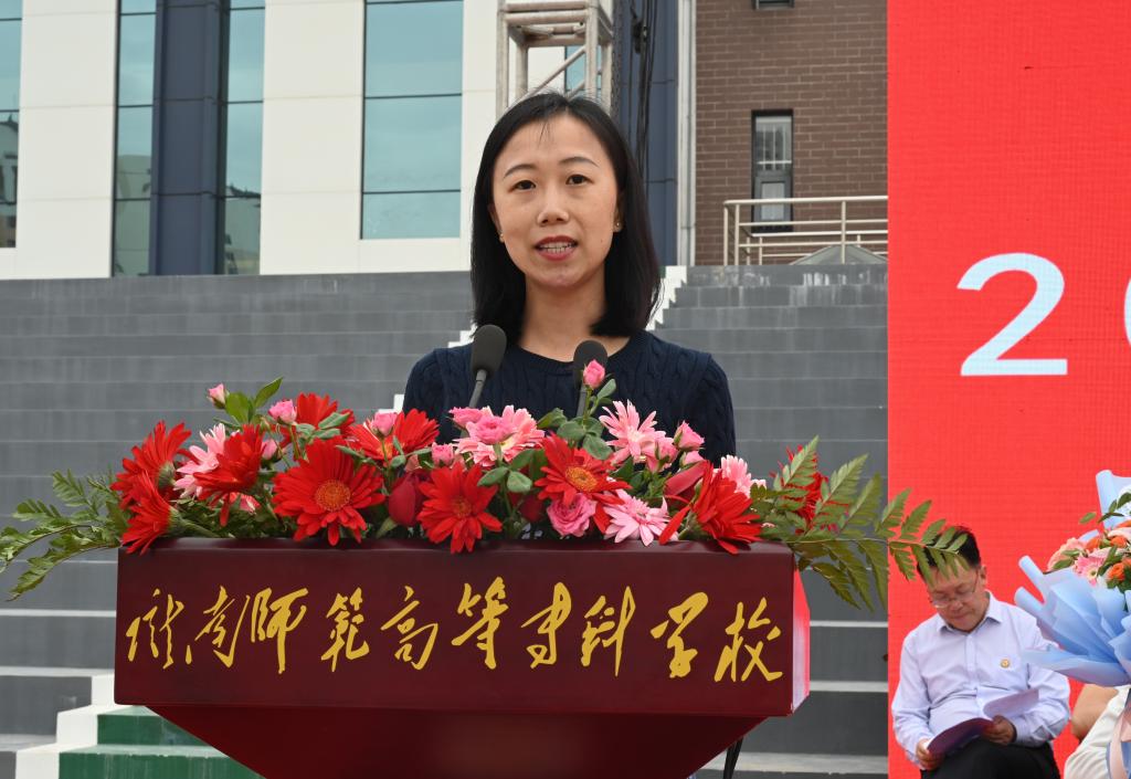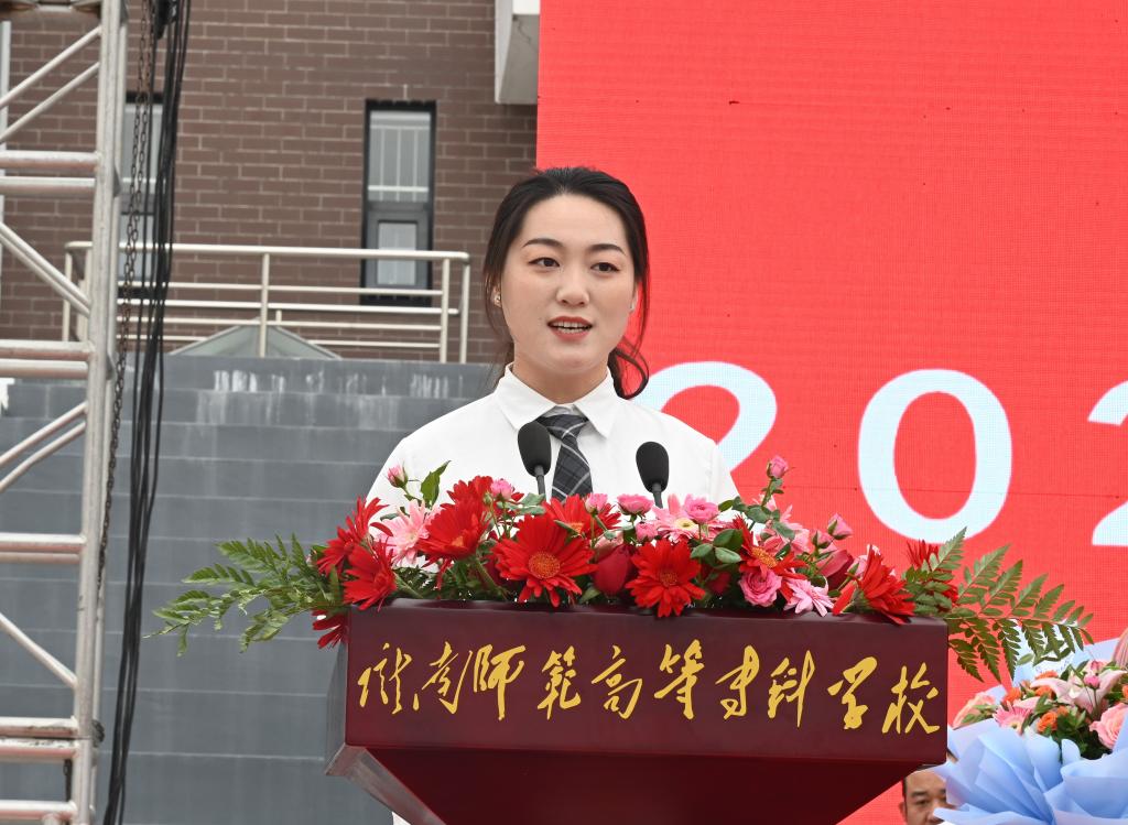 教师代表、初等教育学院颉静表达了对毕业生的祝福,祝愿他们前程似锦,平安快乐。她寄语同学们要牢记母校“养正育德,博学新民”的校训,去读书、去实践、去经历,乘风破浪、披荆斩棘,勇于创新,开拓进取,让青春在为祖国、为人民、为民族、为人类的奉献中焕发出更加绚丽的光彩!