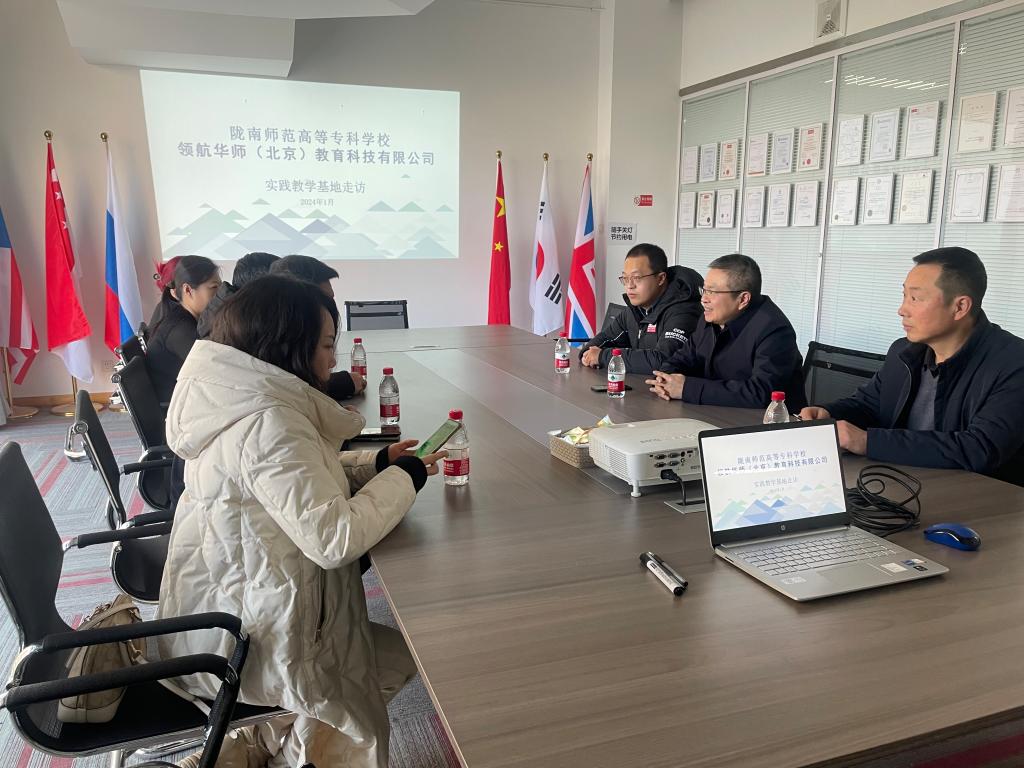 在与领航华师(北京)教育科技有限公司的座谈上,公司代表李艳平对张弢一行的走访调研表示热烈欢迎,并详细介绍了公司发展概况、业务范围、行业特色、发展规划和用人需求情况,并希望与学校进一步加大实习实践合作和共建共享力度,助推毕业生高质量发展。张弢对该公司的快速发展表示赞赏,并围绕学校建设发展、校企合作、实习就业等工作与企业进行了交流沟通。他希望以此次调研走访为契机,搭建实践教学基地平台,进一步深化校企合作、产教融合,在开展订单培养、共建教学资源、优化实习就业等方面充分发挥各自优势,实现双向提升、共同发展、合作共赢的良好愿景。
