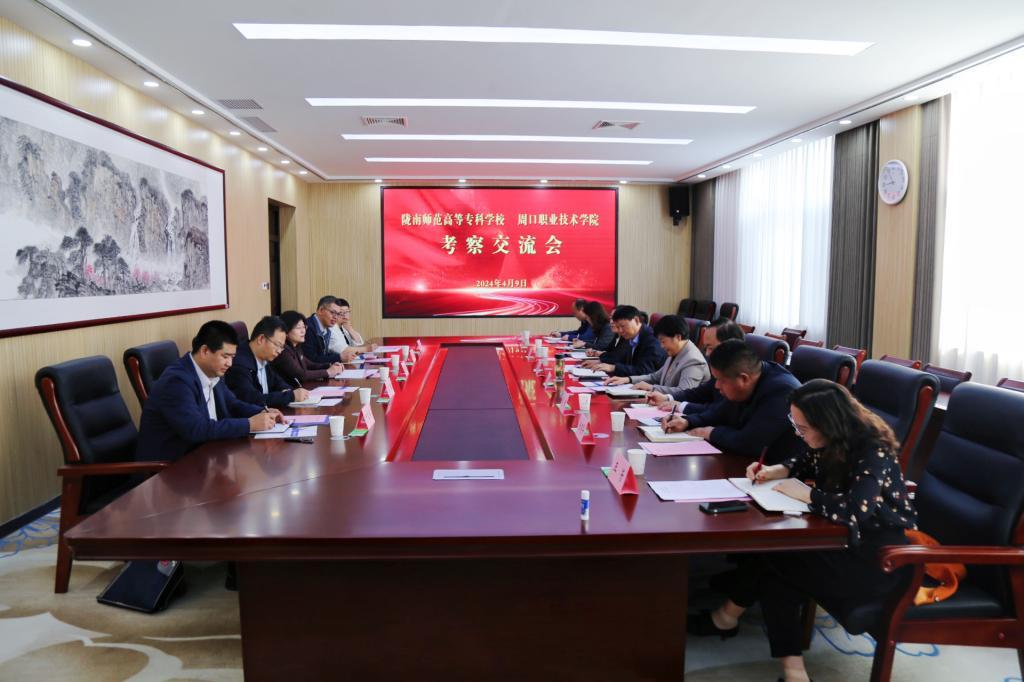 在周口职业技术学院,双方举行交流座谈会。校长李清臣对李艳红一行表示欢迎,李清臣重点介绍了周口市的三大战略性新兴产业及学校的专业建设、校企合作、人才培养、发展目标等情况,总结了近年来学校的办学成效及服务周口地方经济社会发展的重要举措。李艳红介绍了陇南师范高等专科学校的办学历史、专业特色、师资建设、人才培养等情况。她表示,此次考察交流是为了更好地学习周口职业技术学院在专业建设等方面的优秀办学理念,希望两校保持良好的合作交流态势,携手进步,共谋发展。