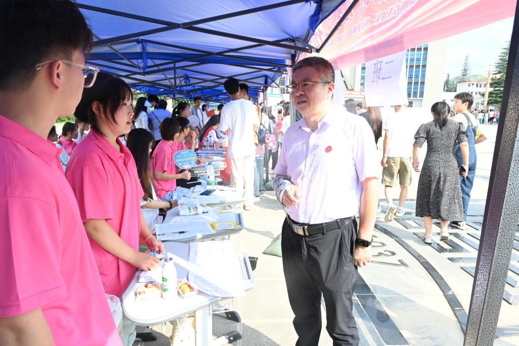 报到现场,张弢与新生及家长亲切交流,询问了新生的生源、专业、入学感受、对学校的期望以及未来的规划等情况,代表学校欢迎学生和家长的到来。他说,大学生活是一个全新的阶段,大家初入大学校园,要尽快适应大学生的新角色。希望新生们能够珍惜大学时光,不负韶华,努力学习,成长为有担当、有追求的社会栋梁之才,同时请家长们放心,学校会为学生们的提供全面的支持和资源,为学生提供优质的教育和成长环境。(文图/李 曼 马佩琴)