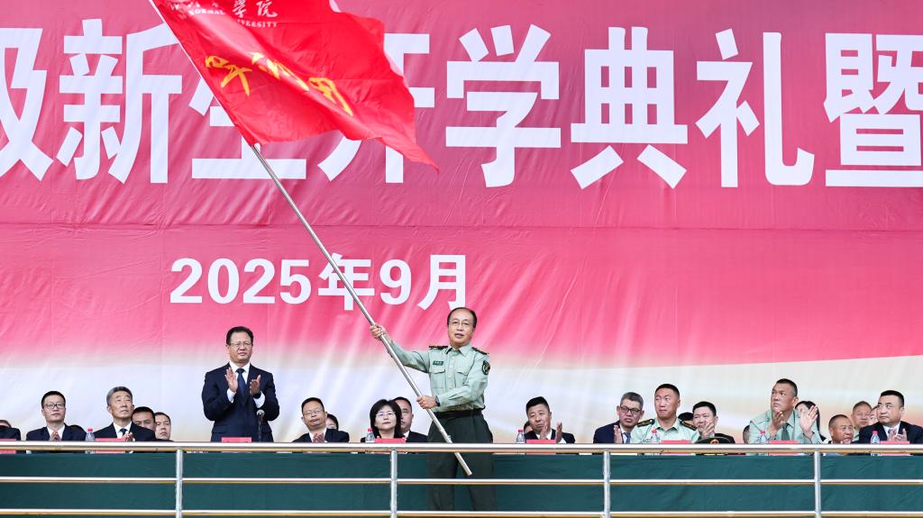 向君为2025级新生授军训团团旗,校领导为10个连授连旗。