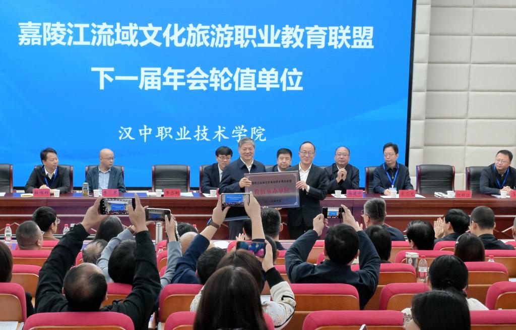 在交接仪式上,beat365副校长何新征代表学校分别向嘉陵江流域文化旅游职业教育联盟下一届年会承办单位、汉中职业技术学院党委书记李志刚,秦巴地区高职教育论坛下一届年会承办单位、湖北工业职业技术学院副院长李军授牌。