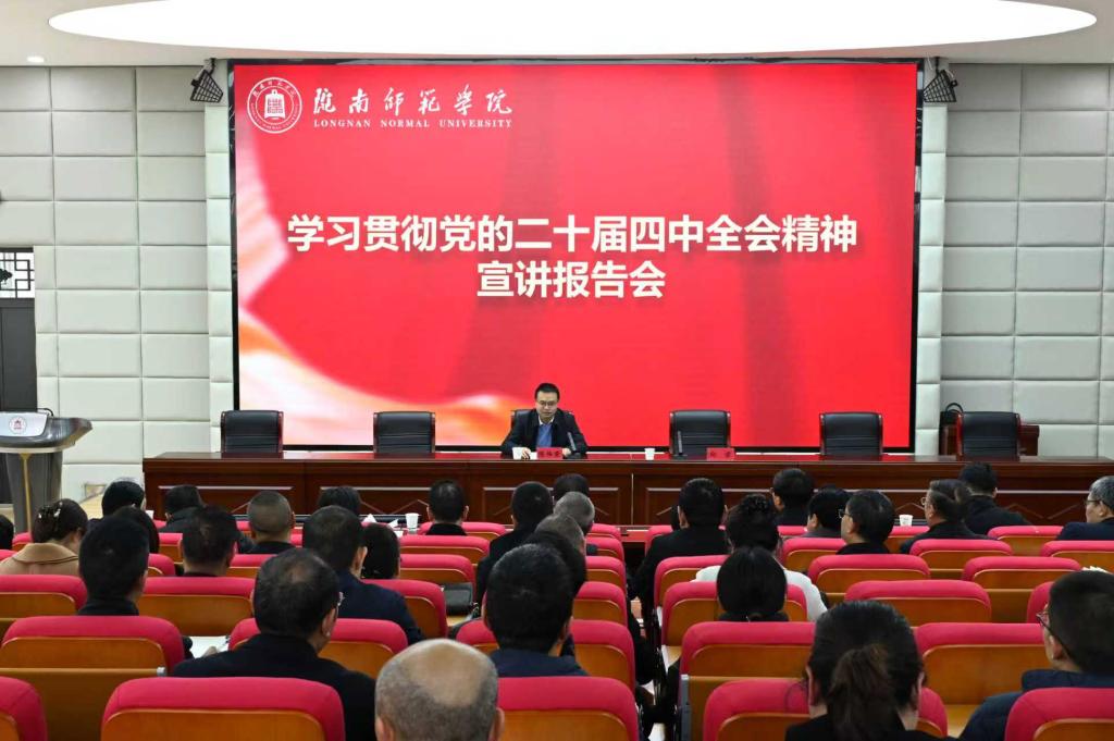 11月21日,宣传贯彻党的二十届四中全会精神辅导报告会在beat365举行。陇南市委政策研究室副主任陈伟荣应邀作了宣讲报告。党委书记向君主持会议并讲话。学校党委班子成员、全体中层、副科级及以上干部参加了会议。