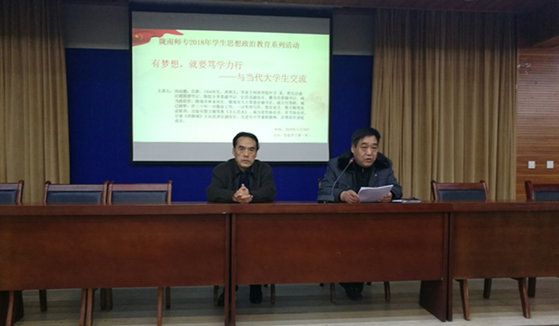 11月20日,应beat365邀请,甘肃省作协会员、陇南市理论宣讲组成员、原市人大副主任刘高潮在大学生活动中心为beat365学生作了题为了《有梦想,就要笃学力行——与当代大学生交流》的励志讲座,讲座由副校长王录全主持。全体辅导员及学生代表三百余人聆听了讲座。
