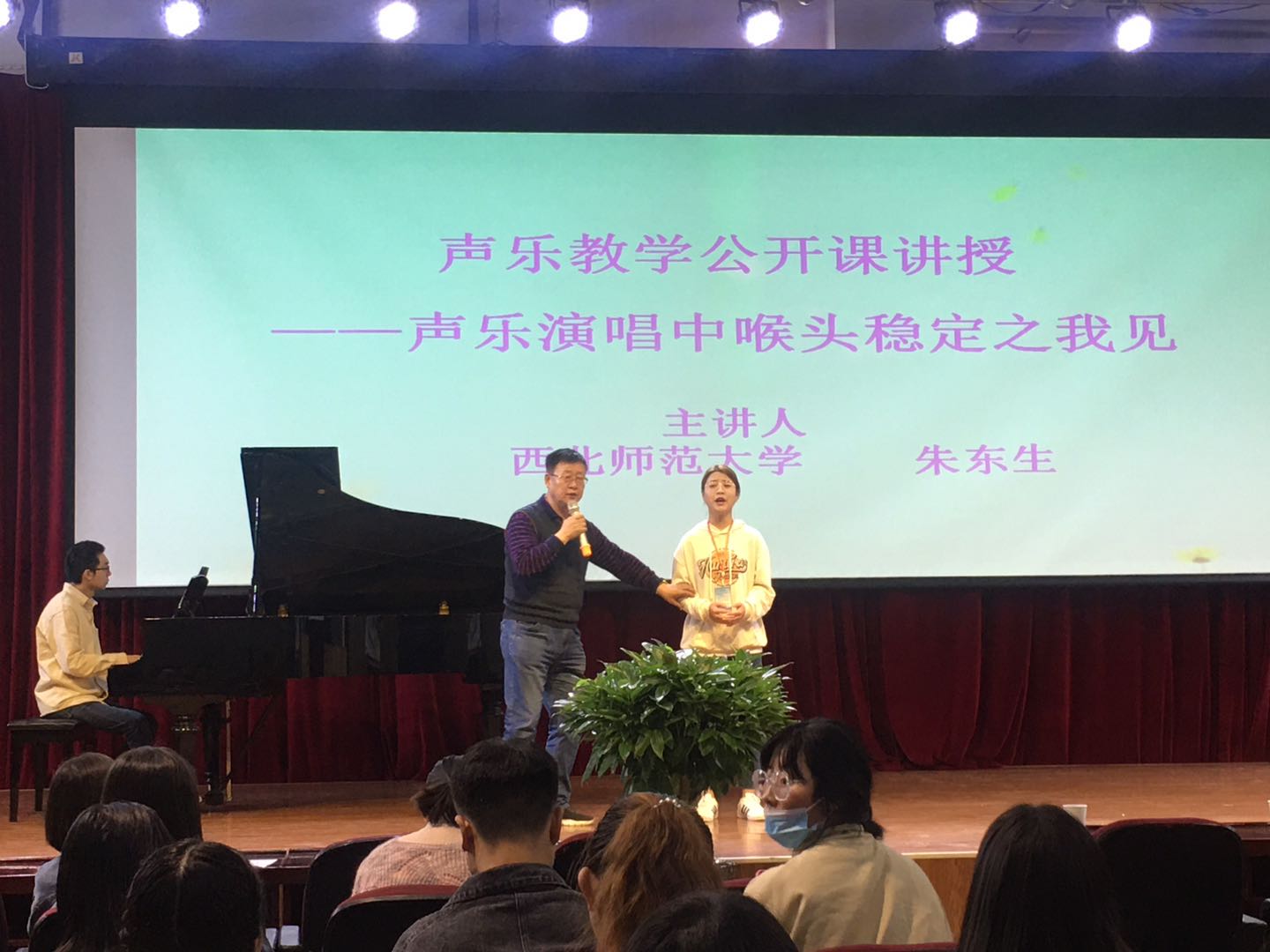 28日,朱东生教授作了题为“声乐演唱中喉头稳定之我见”的学术报告。在报告中,他从自身声乐学习最初对歌唱喉头的认识入手,对喉头器官结构、声带开合、国内外著名歌唱家演唱中喉头的表现和运用等方面进行了深入阐释和分析,重点对歌唱中喉头稳定对歌唱的重要性、以及喉头稳定的练习方法和技巧作了讲解,他还对4名音乐教育专业学生的声乐演唱进行了现场指导,并悉心解答了师生在声乐学习中的疑问。柳廷信作了题为“打造民族品牌,扩大西部影响——从高屋建瓴的态势审视裕固族音乐”的报告。他就音乐大众传媒方式,结合裕固族音乐视频、音频、语言三位一体特点,从裕固族原生态民歌、裕固族民歌的整理改编、裕固族音乐的创作、裕固族音乐的传播、裕固族音乐的未来展望等五个方面对我省独特的少数民族裕固族音乐进行了全方位论述和分析。音乐与舞蹈学院副院长张益琴教授主持报告会。