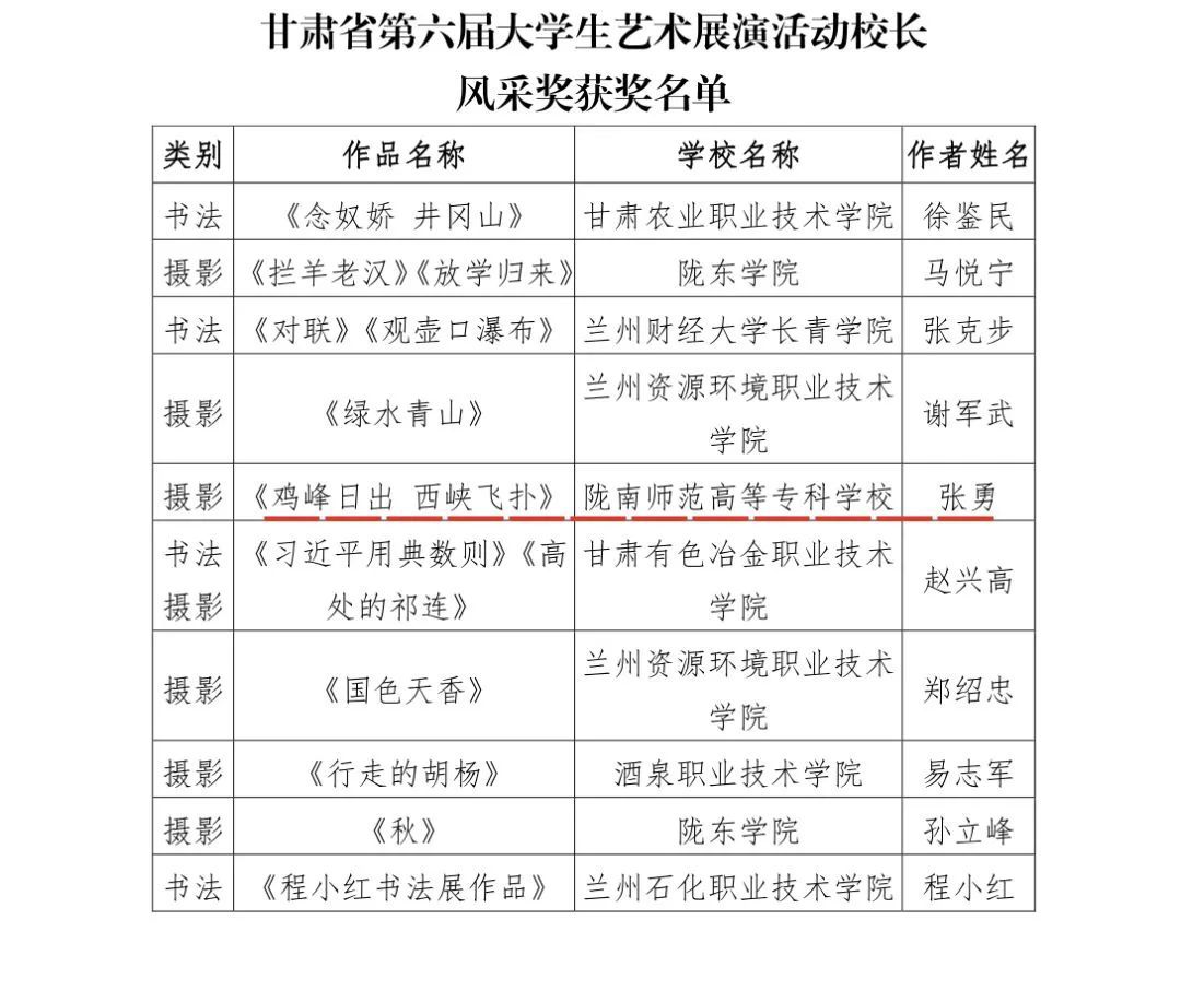 近日,由省教育厅主办的第六届全省大学生艺术展演获奖名单公布,beat365报送的绘画作品《即将消失的村庄》、《生机》分别获得乙组二等奖、甲组三等奖,副校长张勇摄影作品《鸡峰日出、西峡飞瀑》获得校长风采奖,beat365荣获优秀组织奖。