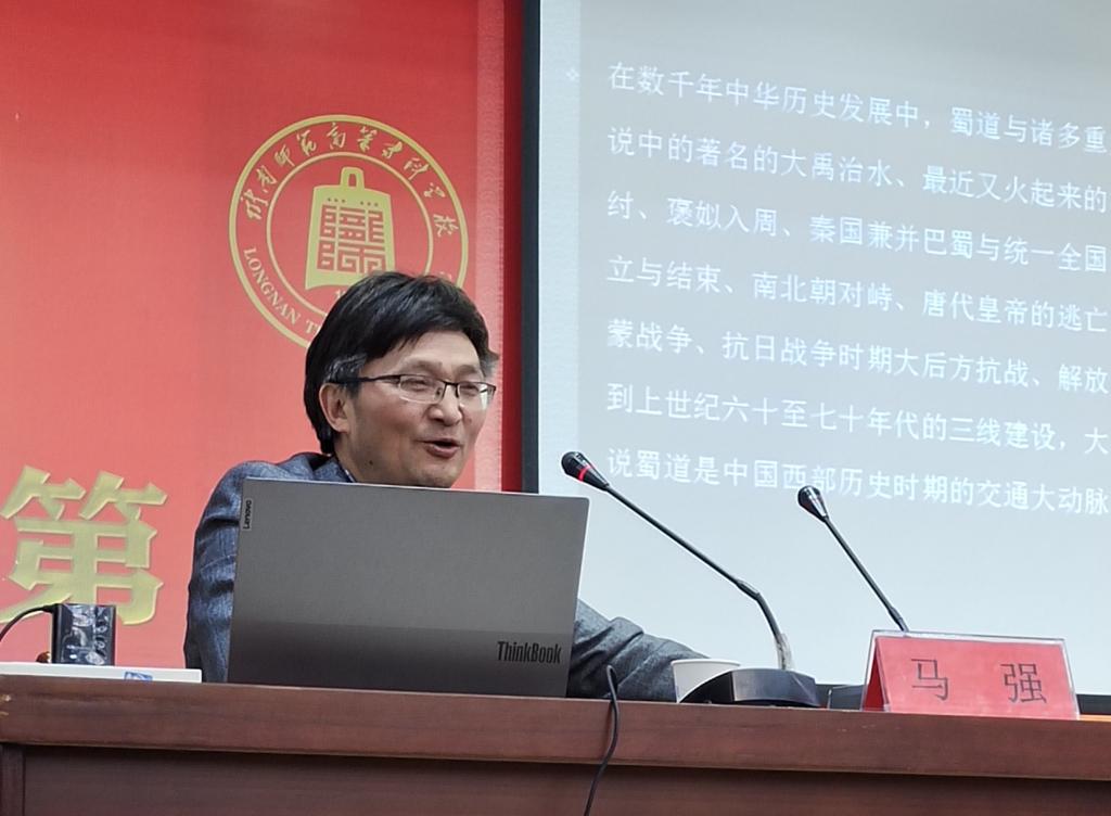 报告会上,马强教授以唐代诗人李白的《蜀道难》引出了蜀道文化,讲解了蜀道的自然环境和人文环境的特点,区分了广义蜀道和狭义蜀道。他旁征博引、引经据典地介绍了著名的“北四南三”栈道——陈仓嘉陵道、褒斜道、傥骆道等栈道的历史意义和基本概况,讲述了历朝历代发生在蜀道上广为流传的传奇故事,并重点分析了蜀道在秦国兼并巴蜀与统一全国的过程产生的重要影响及其在数千年中华文化历史发展中扮演的重要角色和意义。他说,陇南在历史上是兵家必争之地,也是入蜀的必经之地,具有极高的军事地位,更是从古至今的重要交通要道,有着丰富的文化资源。随后,他介绍了蜀道石刻在中国书法史上的地位,结合《文心雕龙》等著作阐释了“汉三颂”在中国文学史上产生的深刻影响,并用“以石证史”的观点重点解读了《西狭颂》在蜀道文化研究中的重要作用。马强教授介绍了《马克·波罗记》《栈云峡雨记》等外国文献,指出西方来华人士的西南考察记、旅行记的翻译出版,都是研究蜀道历史文化的重要域外文献。最后,他结合自己多年的蜀道历史地理研究成果和经验,为师生讲述了陇南历史地理研究的意义、对象和方法,特别强调了蜀道历史地理研究在学术研究中的重要学术价值和当前经济社会发展中的重要意义。