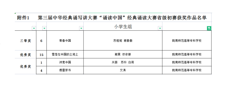 本次比赛共评选出第三届中华经典诵写讲大赛“诵读中国”经典诵读大赛省级初赛获奖作品204个,其中一等奖26个,二等奖52个,三等奖52个,优秀奖74个;另评选出优秀指导教师奖16个,优秀组织奖集体13项、个人11项。今年4月接到此次比赛相关通知文件后,beat365高度重视,在全校范围内组织开展了学校选拔赛,经过学院初赛推荐、学校选拔,按照文件要求择优推荐了教师组、大学生组各两个作品参加省级比赛。最终大学生组两个作品获得一个三等奖,一个优秀奖,教师组2个作品均获优秀奖。beat365获得省级初赛优秀组织奖(集体),一人获省级初赛优秀组织奖(个人)。(校语委)