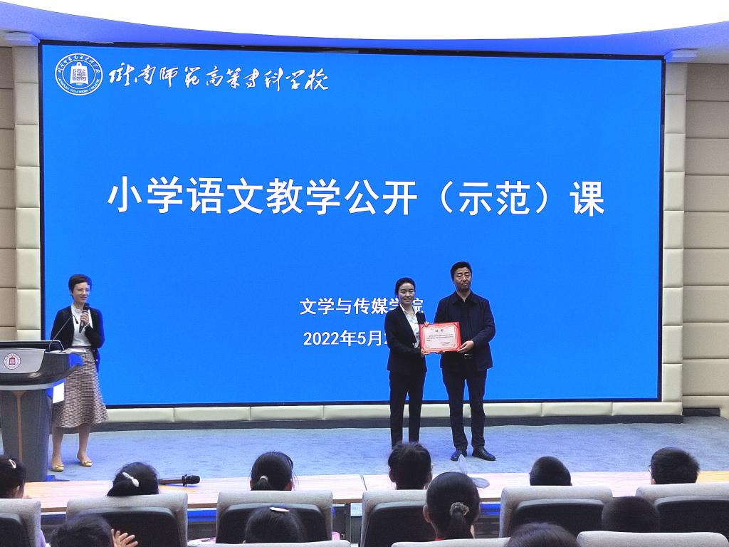 公开(示范)课结束后,鲁建平向李玉玲、彭丽霞颁发了小学语文教育专业实践教学指导教师聘书。(海永珠 吕明丽
