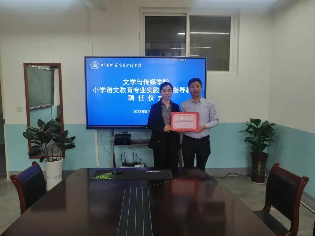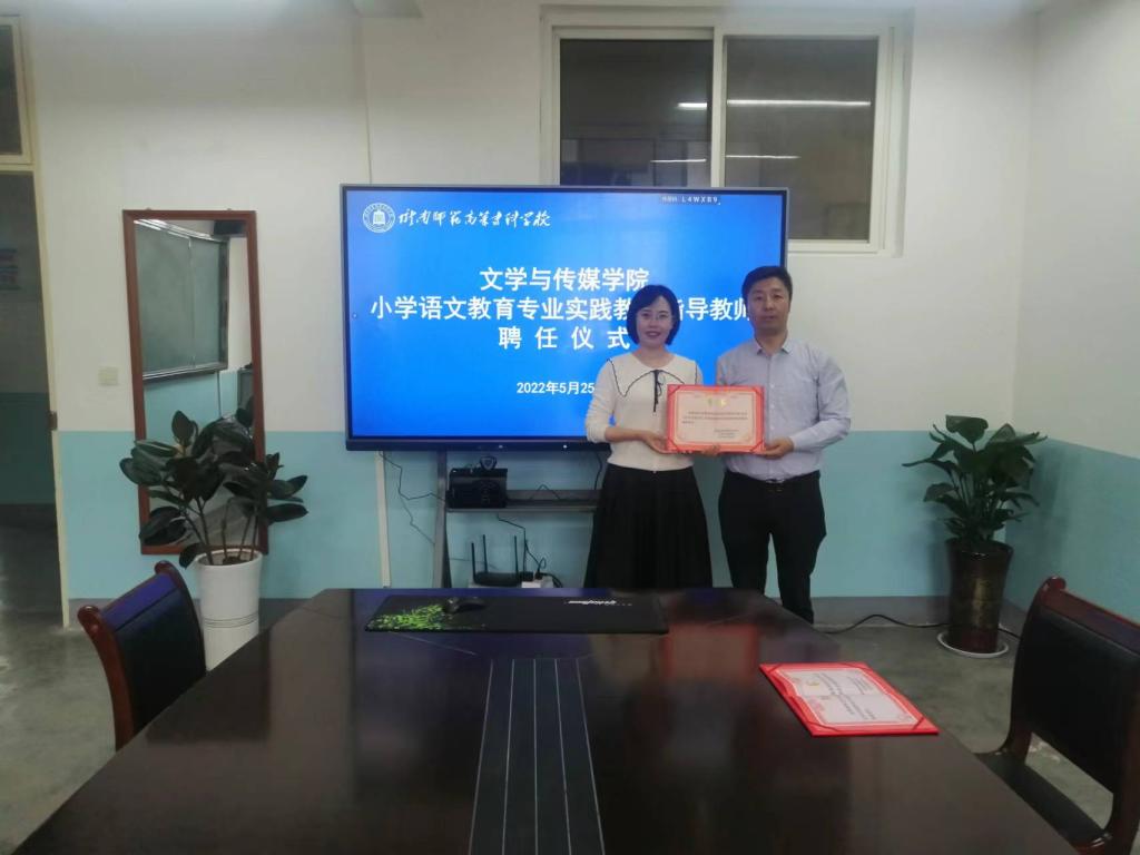 文学与传媒学院院长鲁建平向徽县青年教学能手、优秀教师、徽县实验小学彭丽霞老师颁发小学语文教育专业实践教学指导教师聘书
