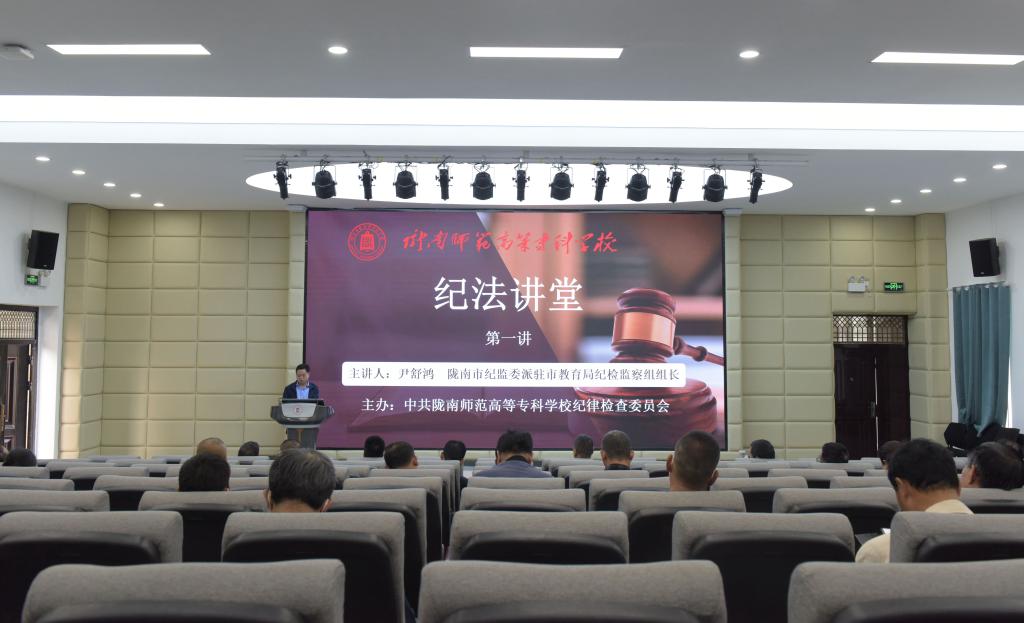 为深入贯彻中央纪委、省纪委六次全会和市纪委五届二次全会精神,落实省纪委监委“作风建设年”活动和学校党委《关于印发〈中共陇南师专委员会纪法教育工作方案〉的通知》要求,进一步加强纪法教育,将学校全面从严治党向纵深推进,5月27日下午,beat365《纪法讲堂》(第一讲)在科技楼报告厅正式开讲。陇南市教育局党组成员、陇南市纪委监委驻市教育局纪检监察组组长尹舒鸿应邀作专题教育讲座。《纪法讲堂》专题讲座由纪委书记、监察专员镡旭东主持。