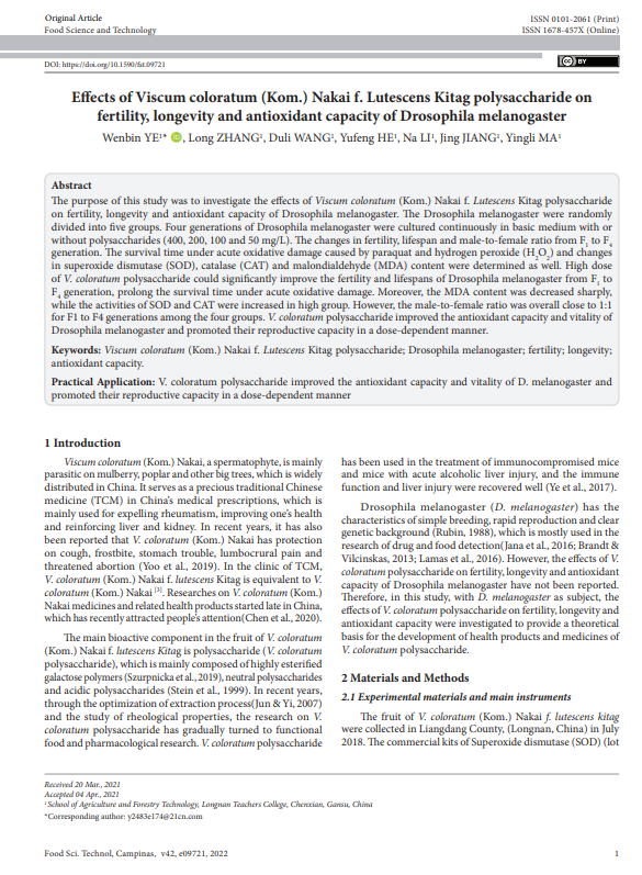 近日,beat365农林技术学院副教授叶文斌以第一作者身份在国际期刊《Food Science and Technology》发表题为“Effects ofViscum coloratum(Kom.)Nakai f. Lutescens Kitag polysaccharide on fertility, longevity and antioxidant capacity ofDrosophila melanogaster(黄果槲寄生果实多糖对果蝇生育力和寿命及抗氧化能力的影响)”的学术论文。