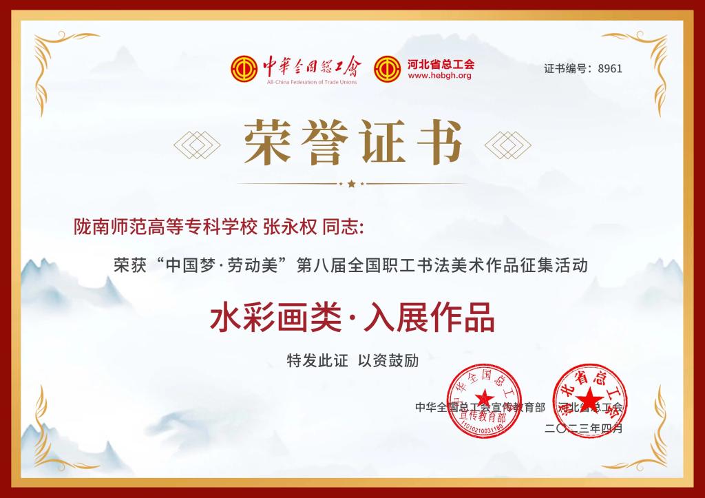 近日,由中华全国总工会宣传教育部、河北省总工会主办,中国职工书法家协会、唐山市总工会承办的“中国梦·劳动美”第八届全国职工书法美术展作品终评结果揭晓。beat365学前教育学院张永权教授水彩画《负重前行》(118cmX78cm)在全国上万件作品中脱颖而出,荣誉入展。