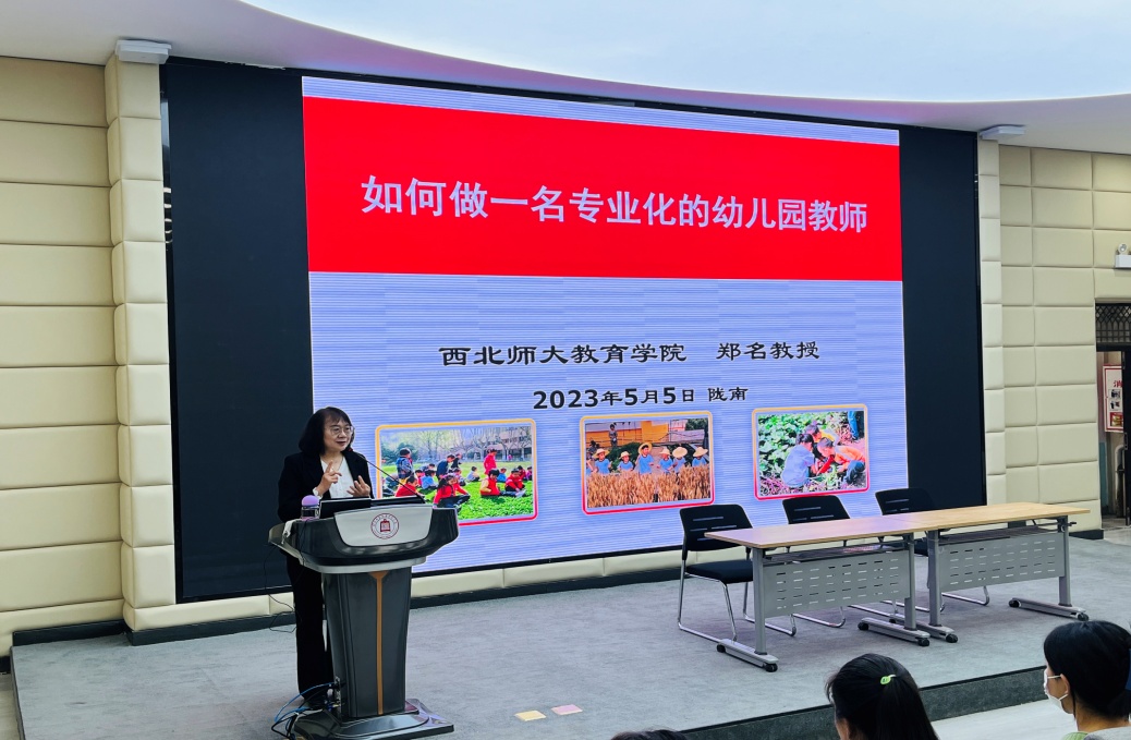 5月5日,应学校邀请,国务院妇儿工委“儿童智库”专家,教育部高等学校幼儿园教师培养教学指导委员会委员,教育部“国培”资源库专家,中国学前教育研究会常务理事,中国学前教育研究会课程与教学专业委员会副主任,甘肃省政府督学,甘肃省学前教育专业指导委员会副秘书长西北师范大学教育科学学院郑名教授,为学前教育学院师生了题为“如何做一名专业化的幼儿园教师”的学术报告。报告由学前教育学院党总支书记李霞主持学前教育学院22级、21级师生共200多人聆听了报告。