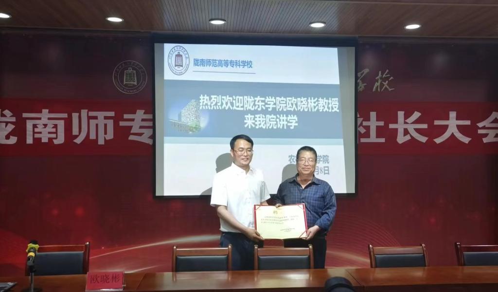 在报告会开始之前,农林技术学院院长王让军给欧晓彬教授颁发农林技术学院特聘教授证书。