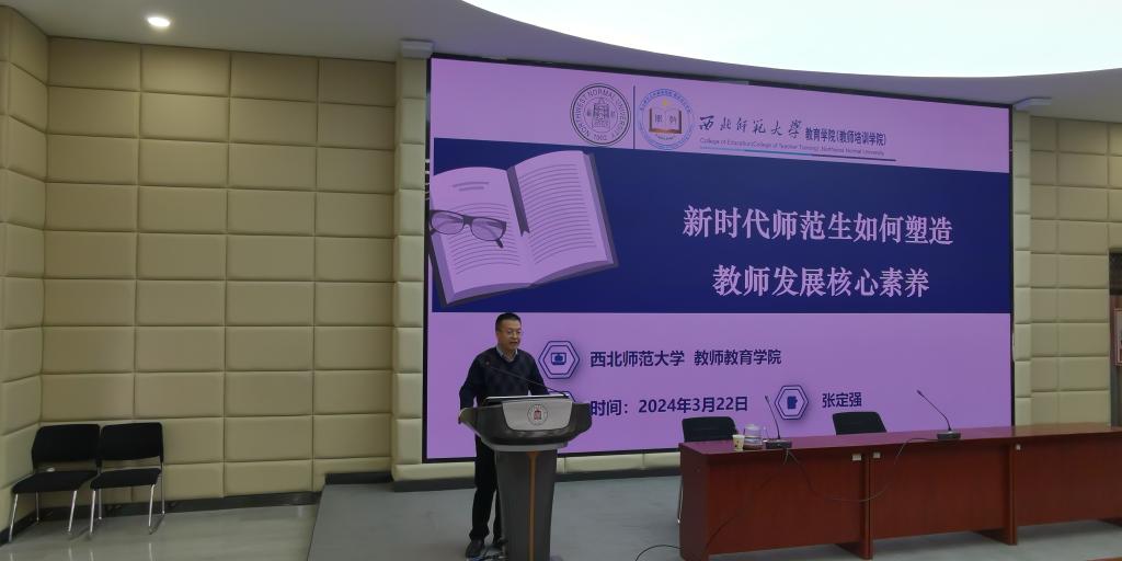 3月22日下午,西北师范大学教师教育学院博士生导师张定强教授作了题为“新时代师范生如何塑造教师发展核心素养”的学术报告。报告会由教务处副处长崔俊峰主持,200多名师生聆听了这场报告。