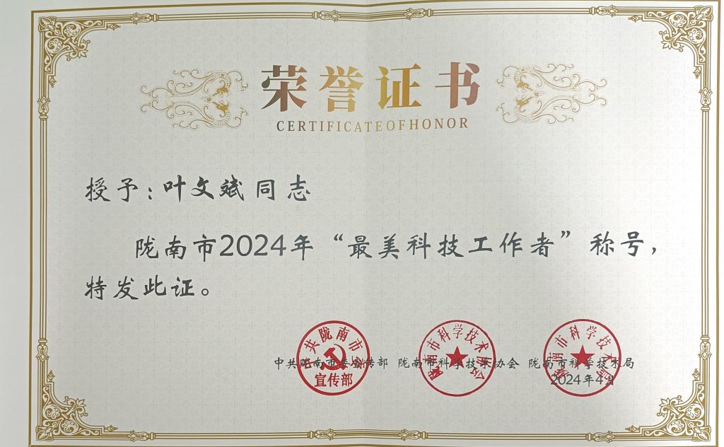 近日陇南市“最美科技工作者”评选结果揭晓,beat365农林技术学院院长、副教授叶文斌获此殊荣。