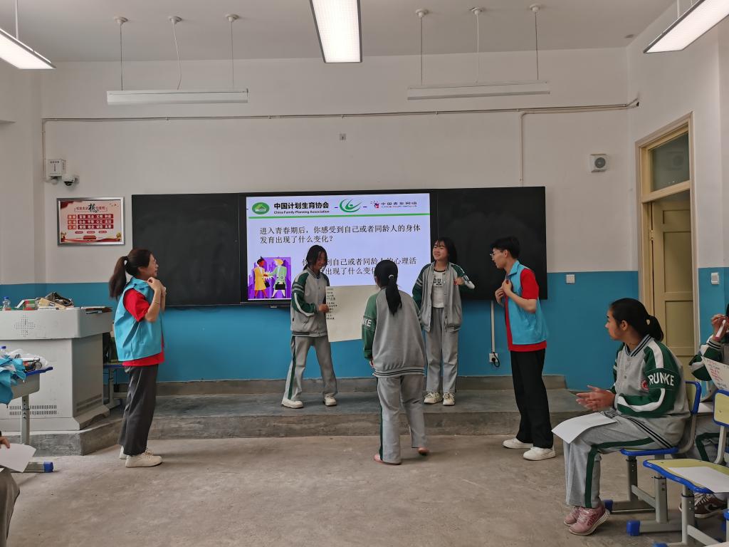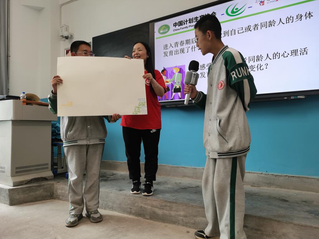 在旧城中学,曾碧老师一行5人为两个班共100多名学生讲授了《迎接青春期》青春期性与生殖健康同伴教育课程。课程通过野火游戏导入青春期的内涵,参与式活动的轻松氛围让大家积极分享自己的青春期的体会,“性别角色下的男女”活动由大学生志愿者引导同学们通过选择游戏明确了自我认知,认识到了悦纳自己的重要性,“我的优点记录表”的展示让大家感受到青春期人际交往中沟通和交流的重要性。