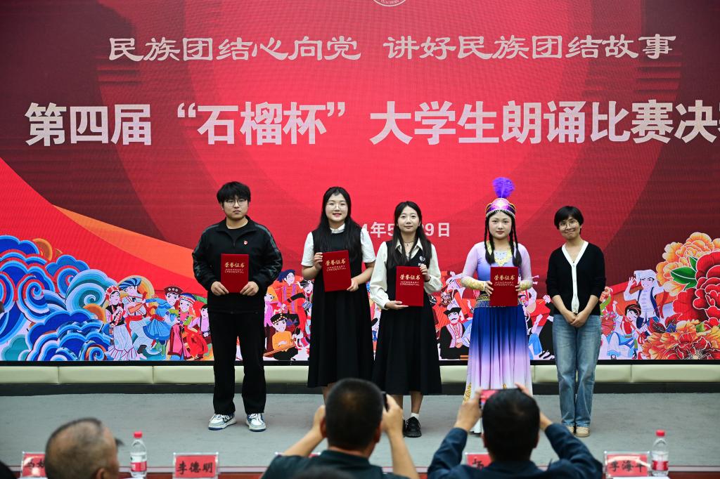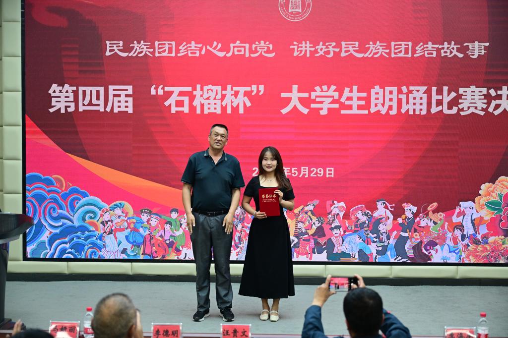 为全面贯彻落实党的二十大精神,推进学校民族团结进步创建工作。5月29日晚,“民族团结心向党,讲好民族团结故事”第四届“石榴杯”大学生朗诵比赛决赛在育心楼109报告厅举行。各个学院部分学生代表200余人观看了比赛。