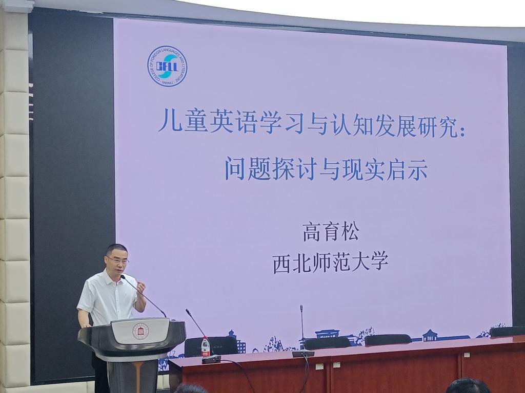 7月7日上午,西北师范大学外国语学院院长高育松教授在育心楼109报告厅作了题为“儿童英语学习与认知发展研究:问题探讨与现实启示”的学术报告。报告由外国语学院副院长姚小淑主持,外国语学院师生共180余人聆听了报告。