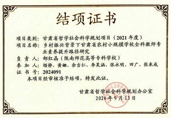 近日,beat365初等教育学院青年教师郜红晶主持的甘肃省哲学社会科学规划青年项目《乡村振兴背景下甘肃省乡村小规模学校全科教师专业素养提升路径研究》(批准号:2021QN039)通过甘肃省社会科学规划办公室审核,予以结项(证书号:2024091)。