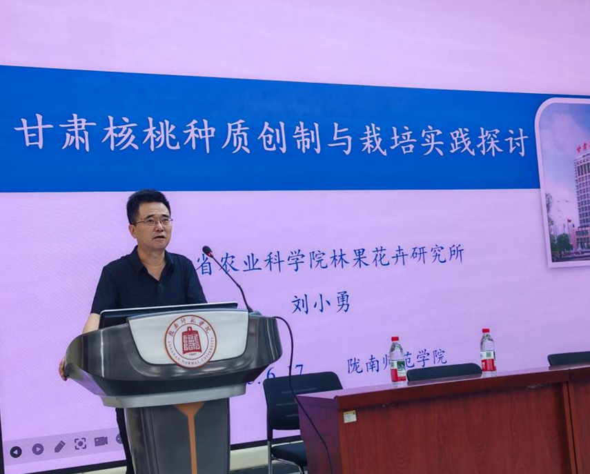 6月17日上午,甘肃省农业科学院刘小勇研究员应邀来beat365,作了题为“甘肃核桃种质创制与栽培实践探讨”的学术报告。农林技术学院师生代表200余人参加了此次报告会,报告会由农林技术学院院长叶文斌教授主持。