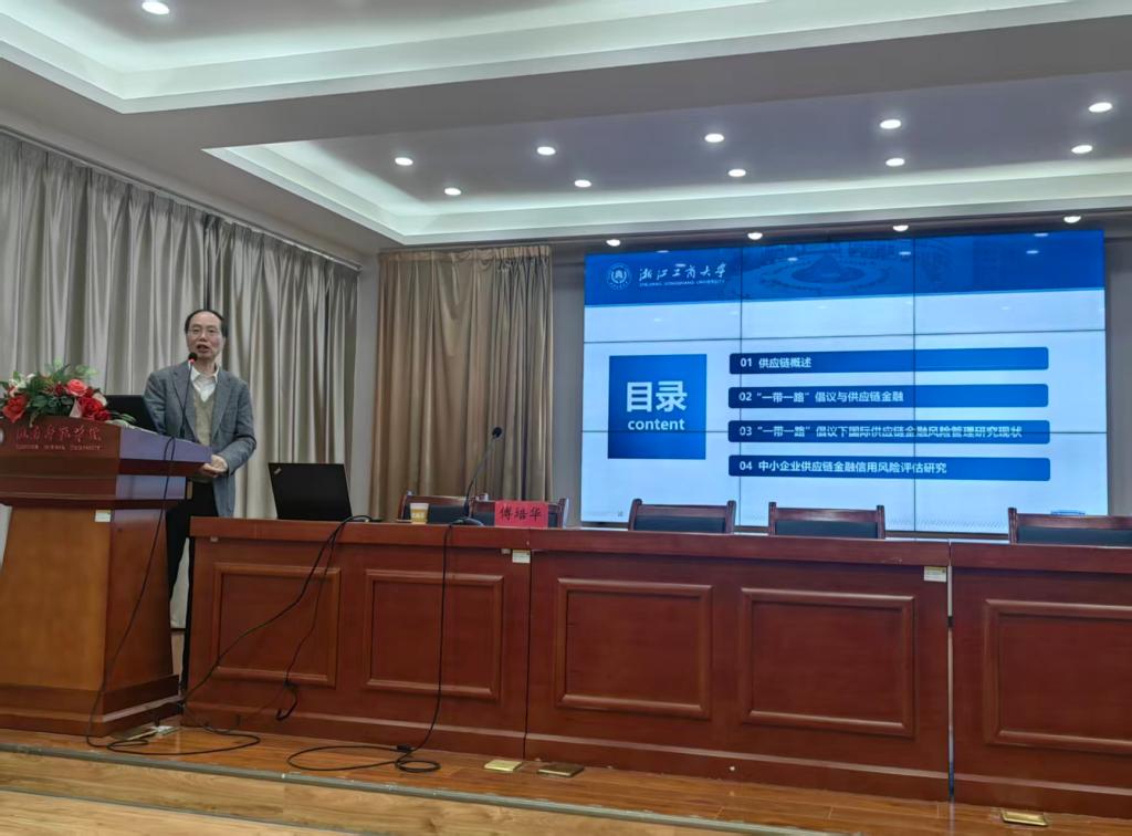 10月24日,浙江工商大学管理工程与电子商务学院傅培华教授应邀来beat365作“‘一带一路’倡议下国际供应链风险传播与防范”专题报告,电子商务学院师生参会。