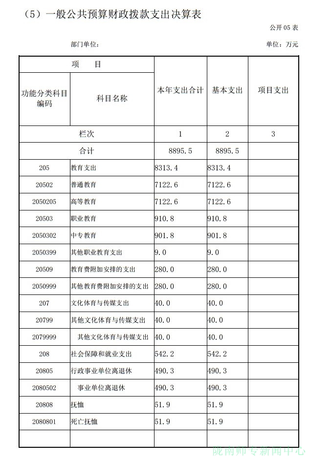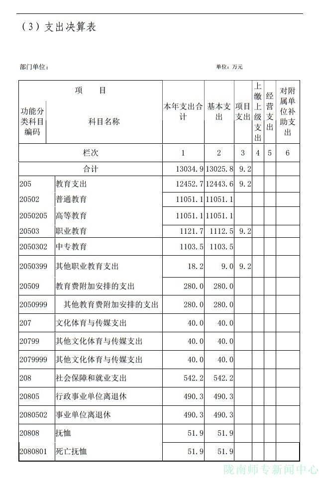 2015年,决算支出13034.9万元,与上年度比较增加953.56万元,同比增长7.31%。按支出经济分类:基本支出13025.8万元,占99.93%;项目支出9.2万元,占0.07%。按支出功能分类:教育支出12452.7元,占95.53%;文化教育与传媒支出40万元,占0.3%;社会保障和就业支出542.2万元,占4.17%;