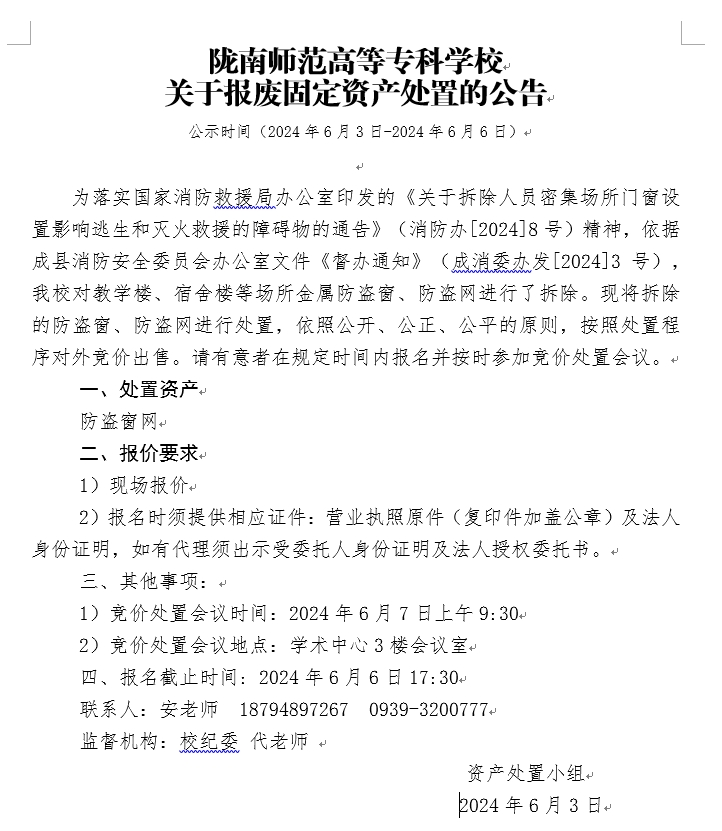 下一条:陇南师范高等专科学校关于报废固定资产处置的公告