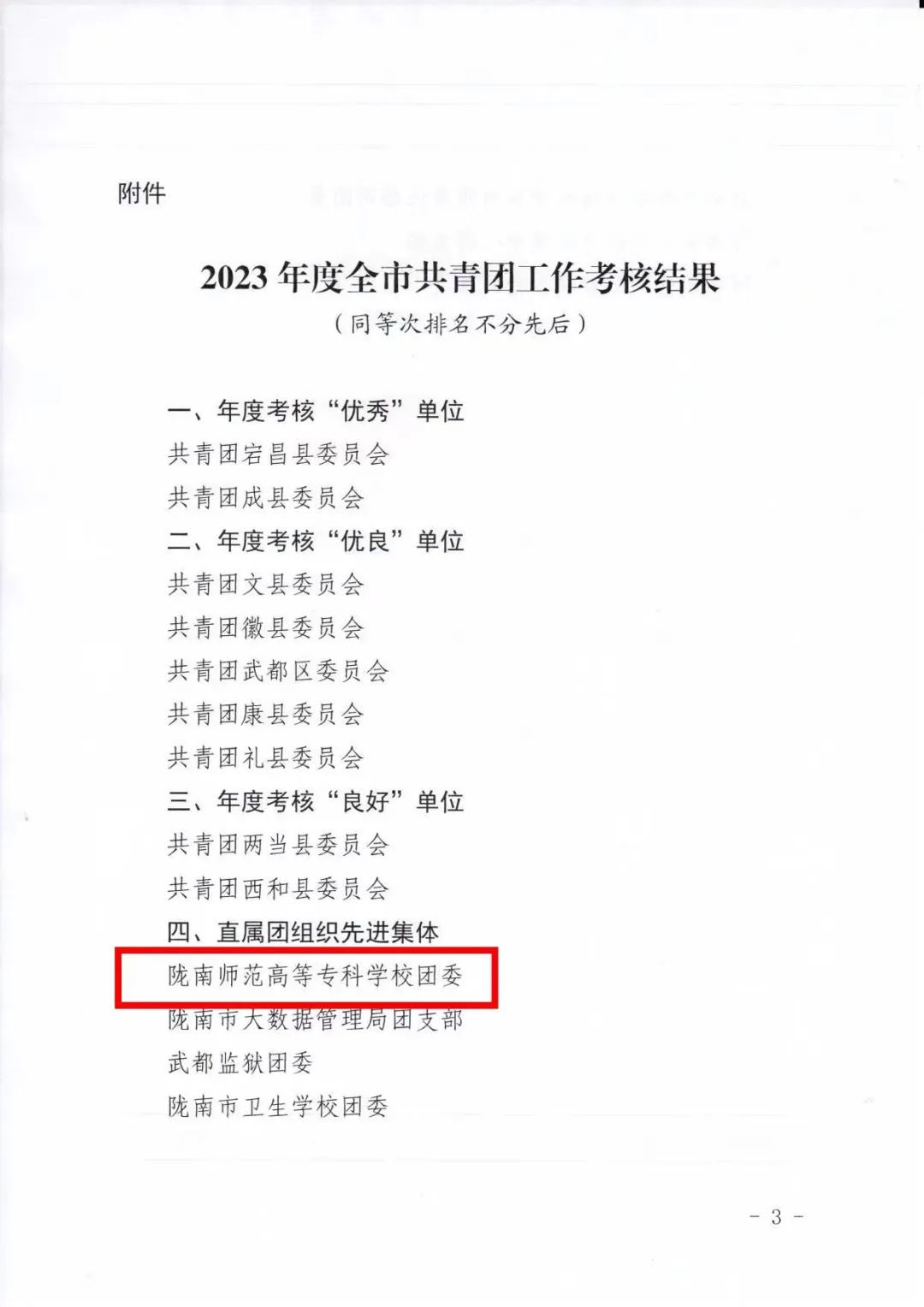 近日,共青团陇南市委员会对2023年度全市共青团工作考核进行了通报,考核结果中,beat365团委荣获直属团组织先进集体称号。