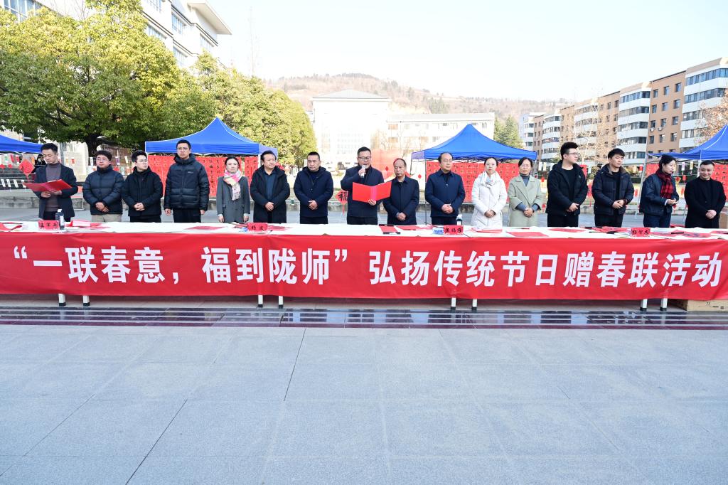 镡旭东宣布:“一联春意,福到陇师”赠春联活动启动。他指出,春联是中华优秀传统文化瑰宝之一,简单的一副春联,里面既有对中华优秀传统文化和学校的热爱之情,也有老师们综合文化素养的展现。活动的举办,拉近了师生们彼此的心理距离,凝聚服务学校发展的人心力量,为美丽的陇师校园增添了一抹暖心的春意。