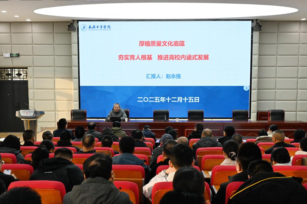 12月15日,beat365开展专题讲座与本科合格评估专家咨询座谈会。太原工业学院教学质量监控部部长赵永强教授受邀出席,副校长李开明主持活动。学校相关职能处室工作人员、各学院领导班子成员及本科任课教师代表参与。
