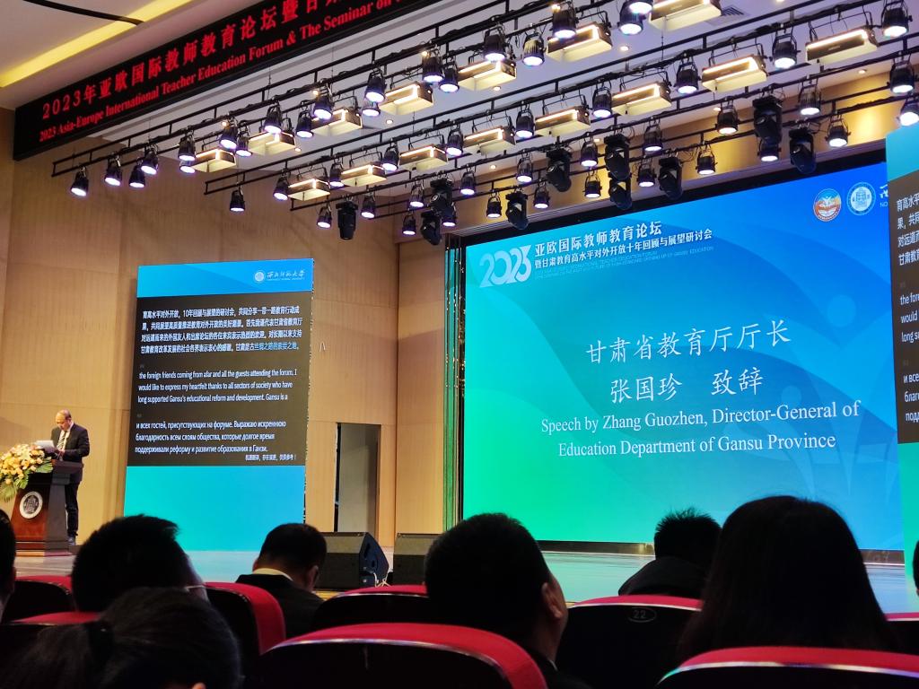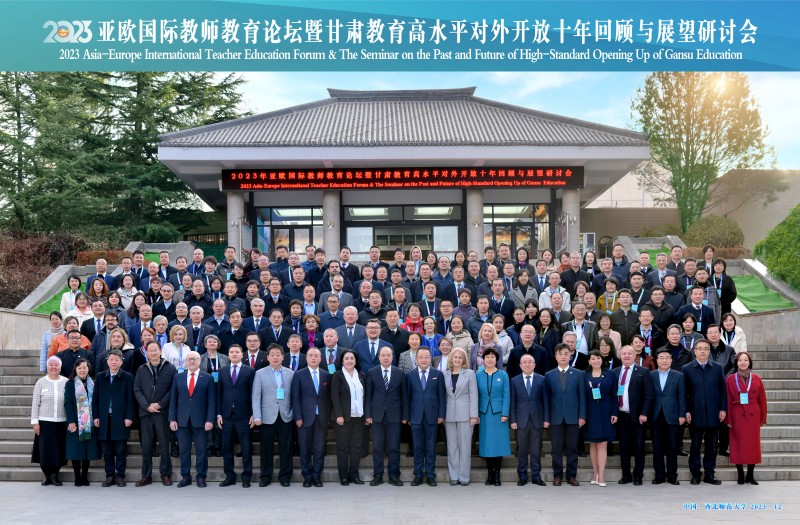 12月11日,2023年亚欧国际教师教育论坛暨甘肃教育高水平对外开放十年回顾与展望研讨会在西北师范大学召开,吸引来自欧洲、亚洲8个国家和中国香港地区、台湾地区的20所高校和机构,以及中国国内部分师范大学教育学科的专家学者约200人参会。教育部国际合作与交流司副司长贾鹏线上致辞,甘肃省委教育工委书记、省教育厅厅长张国珍,省政府外事办副主任赵军出席并致辞,甘肃省委教育工委专职副书记郑钰出席会议,西北师范大学党委书记贾宁出席开幕式并致辞,西北师大校长、党委副书记王占仁主持开幕式。