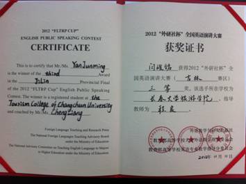 旅游分院闫峻铭同学获2012“外研社杯”全国英语演讲大赛三等奖
