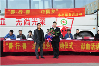 为了表达我们对老团干部的敬意,校团委书记贾烊为老团委书记、心蕊志愿者协会创立者――现任艺术学院副院长李刚献上鲜花;第十届心蕊志愿者协会理事长沈菲介绍“善.行.善―中国梦”志愿服务月的一系列活动;由领导为志愿者服务支队进行授旗仪式;支教志愿者服务支队理事王沛带领全体志愿者宣誓,我们共同表达了无私奉献的决心,承诺坚决遵守志愿者服务的义务;进行“善?行?善―中国梦”人人争当志愿者的签名仪式。献血活动的开始标志着“善 行 善―中国梦”启动仪式的圆满成功。长春市广播电台和城市晚报对本次活动进行跟踪报道。