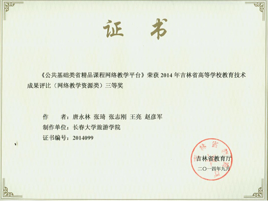 根据2014年10月9日吉林省教育厅文件公布:我院唐永林、张琦、张志刚、王亮、赵彦军等教师的网络教学资源类成果“公共基础类省精品课程网络教学平台”获评2014年吉林省高等学校教育技术成果奖三等奖。