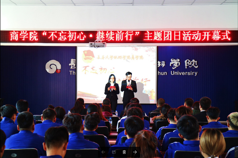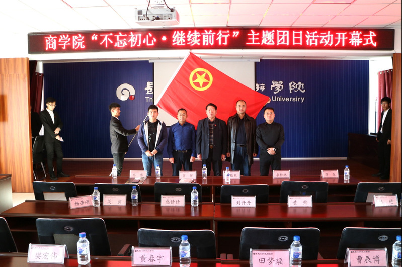 为深入贯彻学习党的十九大精神,激励同学们把爱国热情化作圆梦中华的实际行动,商学院团委于2017年11月14日在校行政楼报告厅隆重举行“不忘初心·继续前行”主题团日活动开幕仪式。学校副书记、副校长马维东,团委书记贾烊,学工部、武装部副部长李桂林,商学院团委书记蒋森共同为活动剪彩。