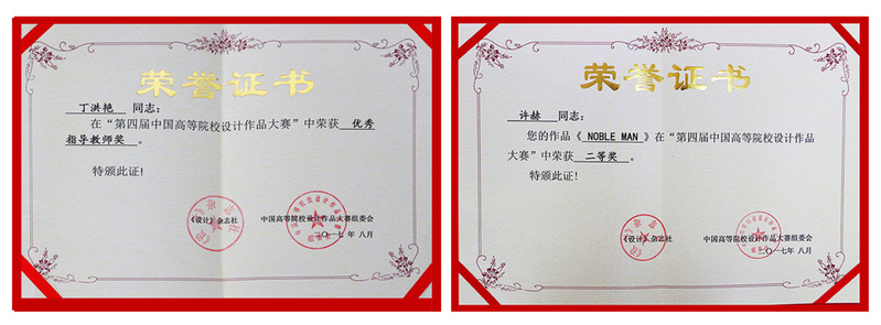 日前,“第四届中国高等院校设计作品大赛”落下帷幕,金沙官网服装与服饰专业学生许赫的作品《NOBLE MAN》荣获二等奖,指导教师丁洪艳获优秀指导教师奖。