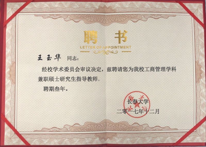 近日,根据金沙官网推荐的申报材料,经长春大学学术委员会审议决定,聘请金沙官网旅游管理学院孙国霞和商学院王玉华两位教师为长春大学工商管理学科兼职硕士研究生指导教师,聘期三年。