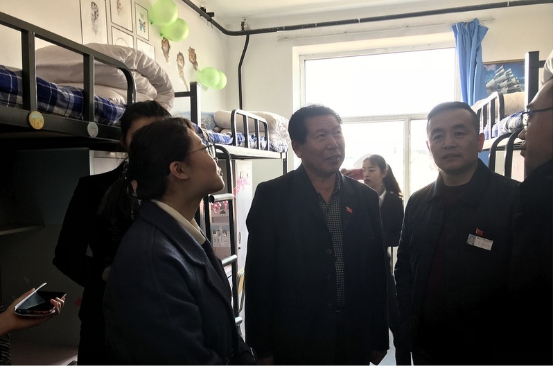 外国语学院、国际交流学院(处)党总支书记于刚,公寓中心主任张力,外国语学院、国际交流学院(处)团委书记孙野,及部分师生代表共同参观了2017级学生寝室。