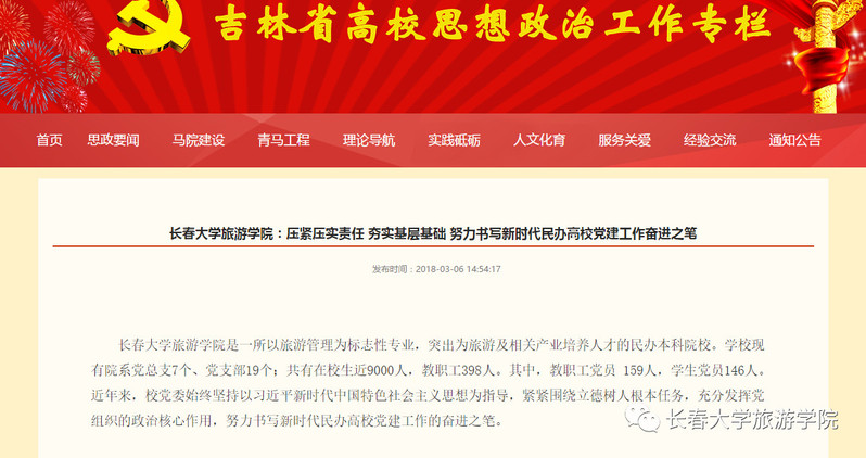 近日,吉林省委机关刊物《吉林通讯》(2018年第三期)和吉林省教育厅官网吉林省高校思想政治工作专栏相继刊发金沙官网党委题为《压紧压实责任 夯实基层基础 努力书写新时代民办高校党建工作奋进之笔》的党建经验文章。