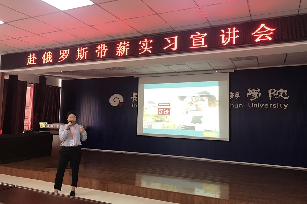 此次赴俄带薪实习项目以汉语教学为主要内容。宣讲会上,项目相关负责人李星晓老师通过自己丰富的海外生活经历讲述了出国留学和实习就业的相关注意事项,她鼓励学生跟上时代步伐,抓住机会,拓宽视野,实现蜕变。另一位项目负责人伊娜老师详细介绍了赴俄带薪实习的优势、薪酬核算方式、俄罗斯中小学资质、教授学生情况、授课内容、住宿条件、办理审核流程等。