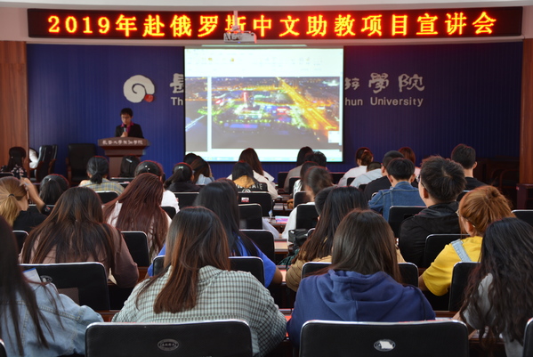 近日,学校国际交流处在行政楼三楼报告厅举办了2019年赴俄助教带薪实习宣讲会。外国语学院、国际交流学院俄语专业及汉语国际教育专业百余名学生参加了宣讲会。宣讲会由外国语学院、国际交流学院教师刘奕兵主持。
