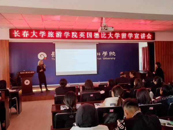赴英留学宣讲会由来自英国德比大学旅游管理学院的主任斯托克代尔女士主讲。学校副校长贺柏平出席宣讲会。国际交流处处长、外国语学院、国际交流学院院长黄江,旅游管理学院副院长周丽君、吴洪亮,国际交流处副处长、外国语学院、国际交流学院副院长王丹以及旅游管理学院120余名师生参加宣讲会。