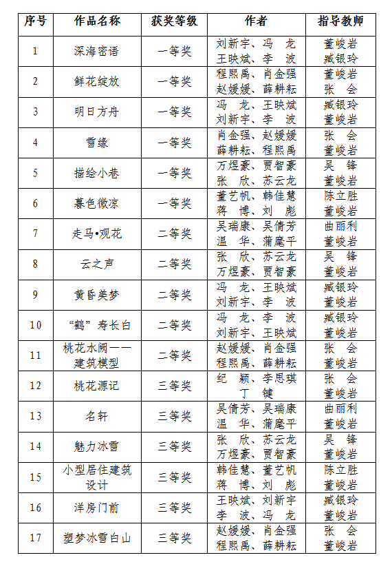近日,学校工学院师生在2019年第三届“国青杯”全国高校艺术与设计作品展评大赛中荣获17个奖项,其中一等奖6项,二等奖5项,三等奖6项;工学院建筑学专业带头人董峻岩荣获“优秀组织教师”称号;董峻岩、臧银玲、张会、吴锋、陈立胜、曲丽利6位教师荣获“优秀指导教师”称号。
