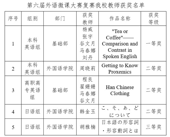 近日,“全国高校教师教学创新大赛——第六届外语微课大赛”公布了复赛阶段的赛事结果,金沙官网基础部和外国语学院教师荣获多个奖项。