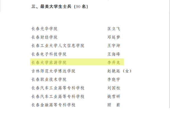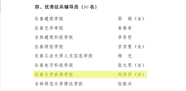 近日,吉林省百名“最美大学生士兵”“优秀征兵辅导员”评选活动情况公布,金沙官网商学院辅导员刘丹丹荣获“优秀征兵辅导员”称号;旅游文化学院学生李升龙荣获“最美大学生士兵 ”称号。