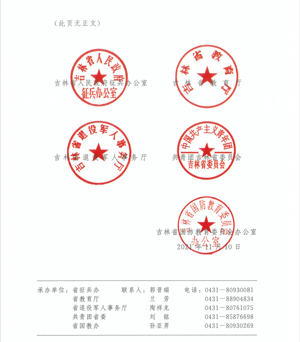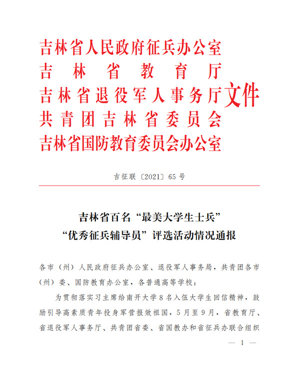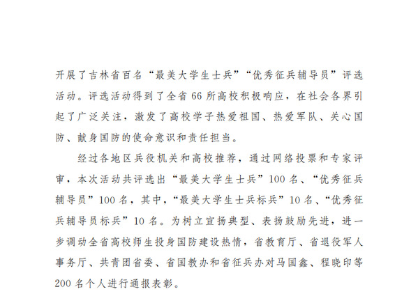为贯彻落实习近平主席给南开大学8名入伍大学生回信精神,鼓励引导高素质青年投身军营报效祖国,5月至9月,省教育厅、省退役军人事务厅、共青团省委、省国教办和省征兵办联合组织开展了吉林省百名“最美大学生士兵”“优秀征兵辅导员”评选活动。评选活动得到了全省66所高校积极响应,在社会各界引起了广泛关注,激发了高校学子热爱祖国、热爱军队、关心国防、献身国防的使命意识和责任担当。