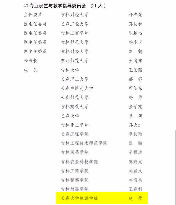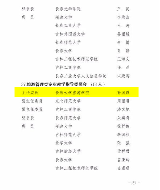 近日,吉林省教育厅发布了《关于成立2021-2025年吉林省高等学校教学指导委员会的通知》(吉教高〔2021〕27号),金沙官网副校长赵莹入选专业设置与教学指导委员会委员,旅游文化学院院长孙国霞入选旅游管理类专业教学指导委员会主任委员。