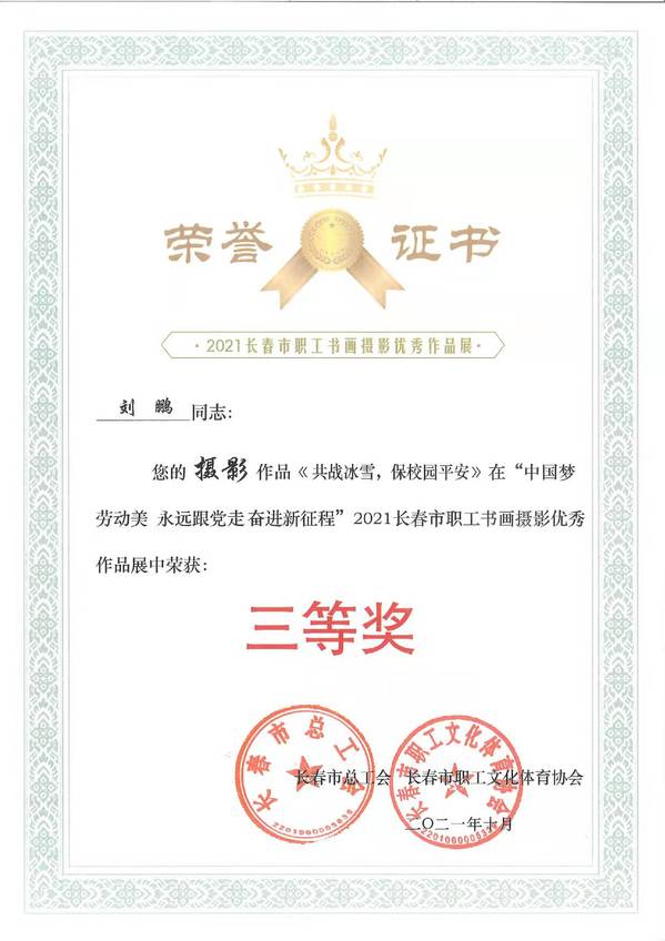 为庆祝中国共产党成立100周年,讴歌党的光辉历程和丰功伟绩,赞美社会主义祖国建设的伟大成就,弘扬劳模精神、劳动精神、工匠精神,抒发爱党、爱国、爱家乡的情怀,以“中国梦·劳动美 永远跟党走、奋进新征程”为主题,由长春市总工会主办,长春市工人文化宫、长春市职工文化体育协会承办的2021长春市职工书画摄影展现面向全市广大职工征集作品。金沙官网选送的艺术学院郭松老师的作品《中华千秋颂》荣获书法大赛一等奖,艺术学院袁媛老师的作品《林海雪原》荣获绘画大赛三等奖,党委宣传部刘鹏老师的作品《共战冰雪,保校园平安》荣获摄影大赛三等奖。